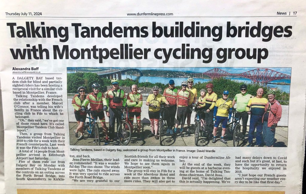 Visite en Ecosse en Juillet 2024, chez nos partenaires de Talking Tandems (article du Dunfermline press):